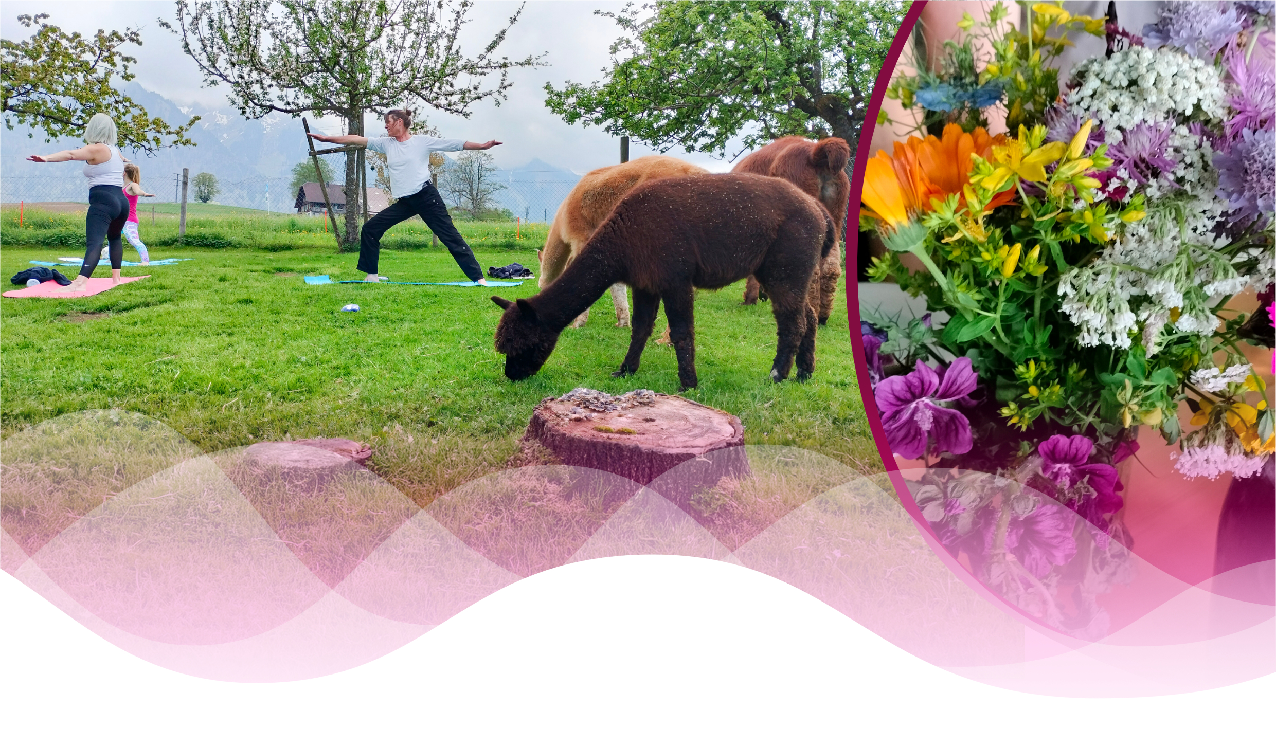 Erlebe eine besondere Yoga-Stunde inmitten von Alpakas, Ziegen, Truthahn und