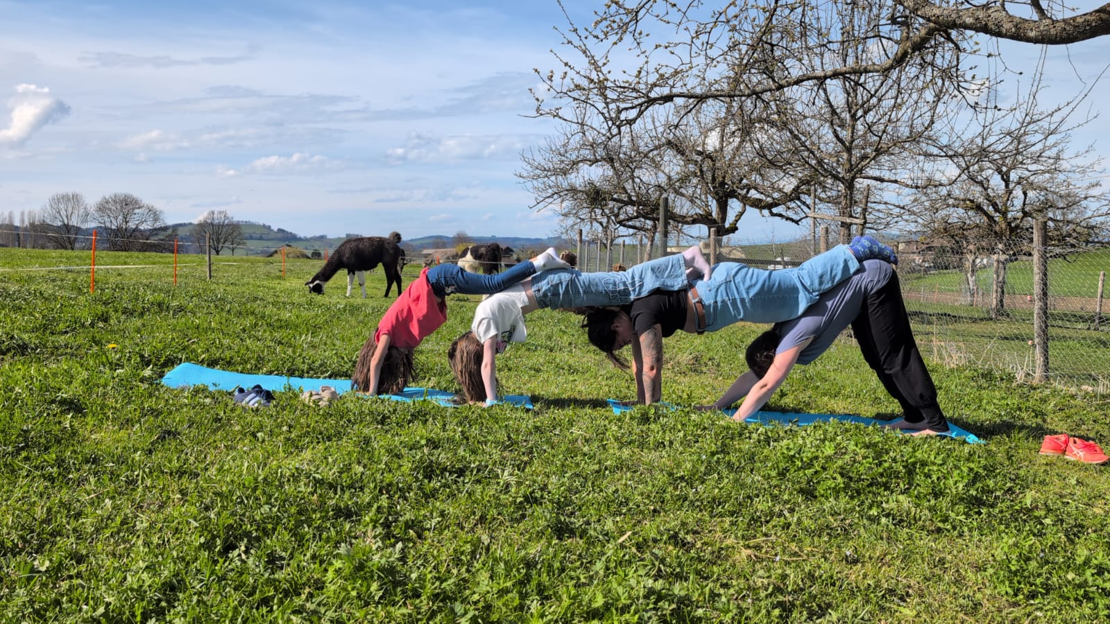 Erlebe eine besondere Yoga-Stunde inmitten von Alpakas, Ziegen, Truthahn und