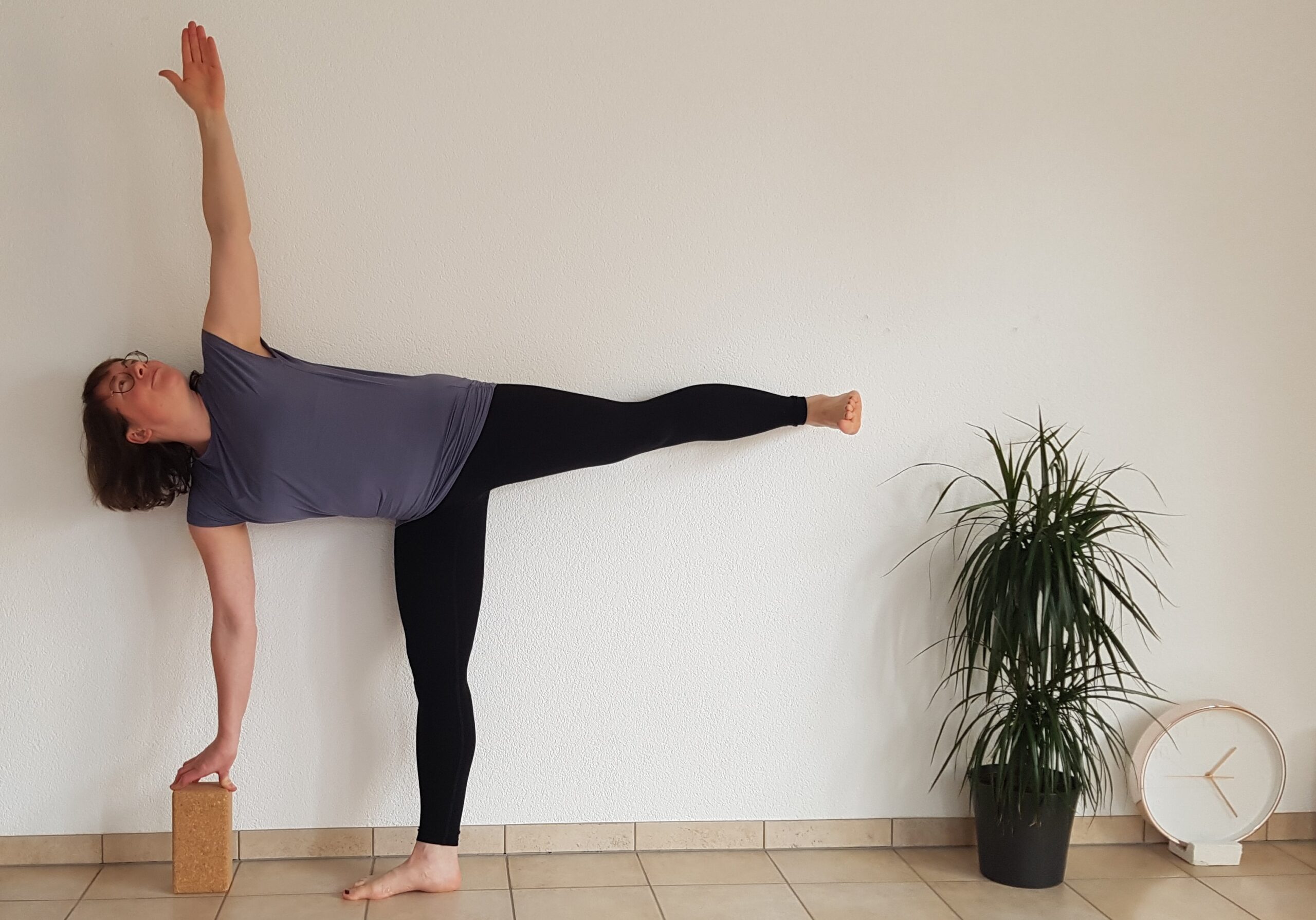 Brigitte Boss in einer Yoga Pose. Der Block aus Kork bringt den Boden nähner zur Hand.